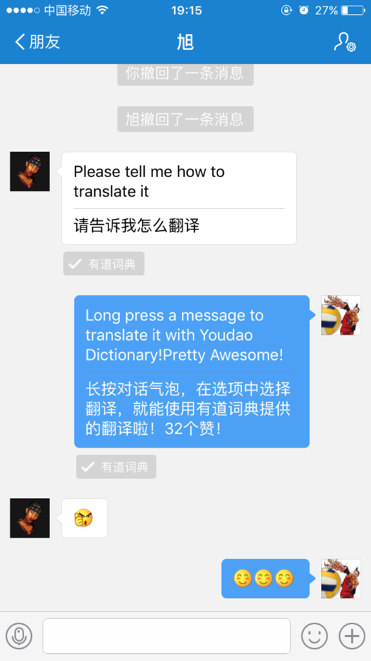微信微信使用有道提供的内置翻译功能,用户长按消息后可选择翻译功能,将消息译为系统语言,轻松与外国友人交流。此服务为定制场景,包括但不限于表情符号优化、昵称优化、微信聊天常用词汇特定质量改化等。